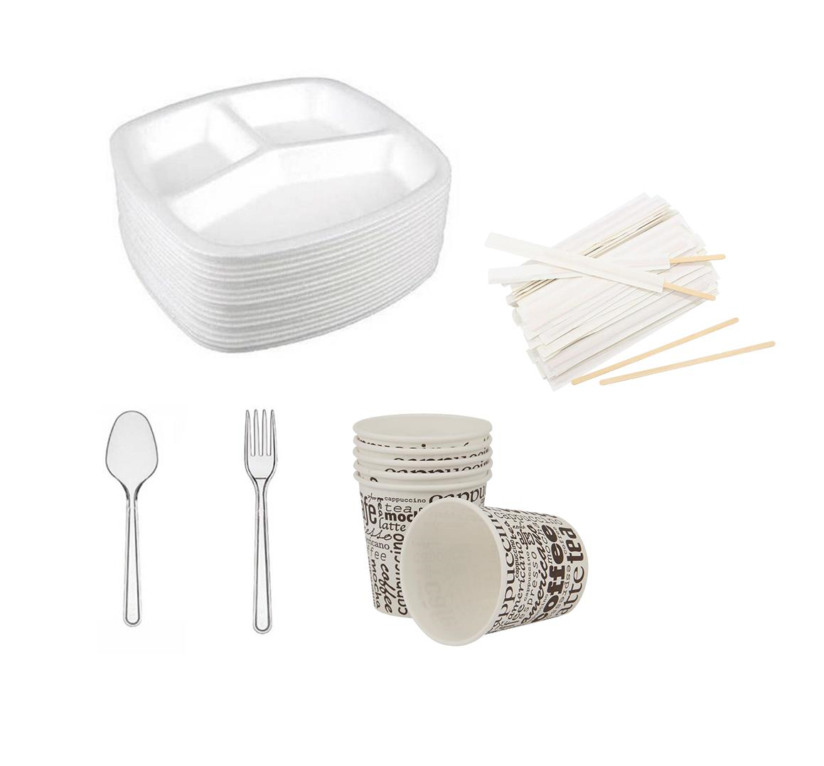 TEZYOLLA 3 Gözlü Köpük Tabak + Karton Bardak + Kaşık + Çatal + Karıştırıcı 5 Li SET 25 Adet
